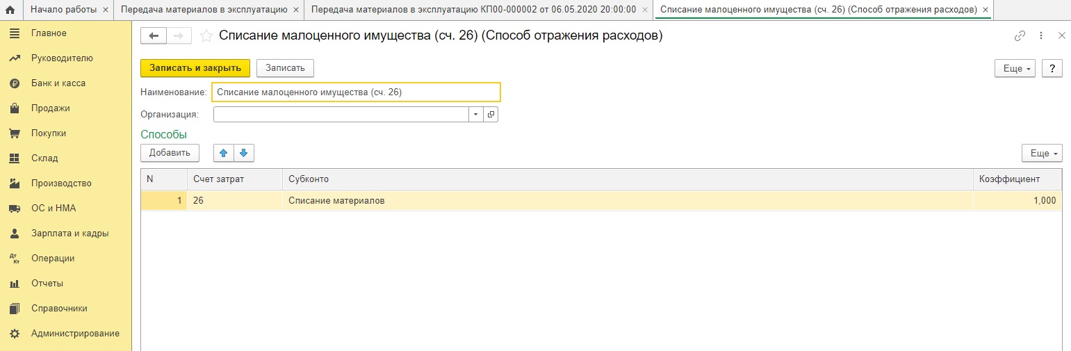 Когда нужно будет списать инвентарь с забалансового учета, понадобится ввести документ «Списание материалов из эксплуатации», основываясь на ранее внесенном «Передача материалов в эксплуатацию» или создав новый в категории «Склад».