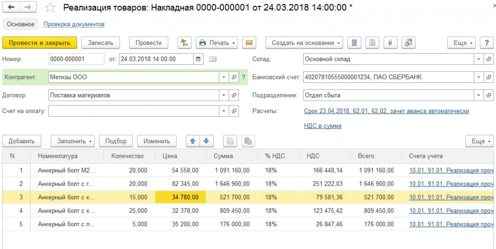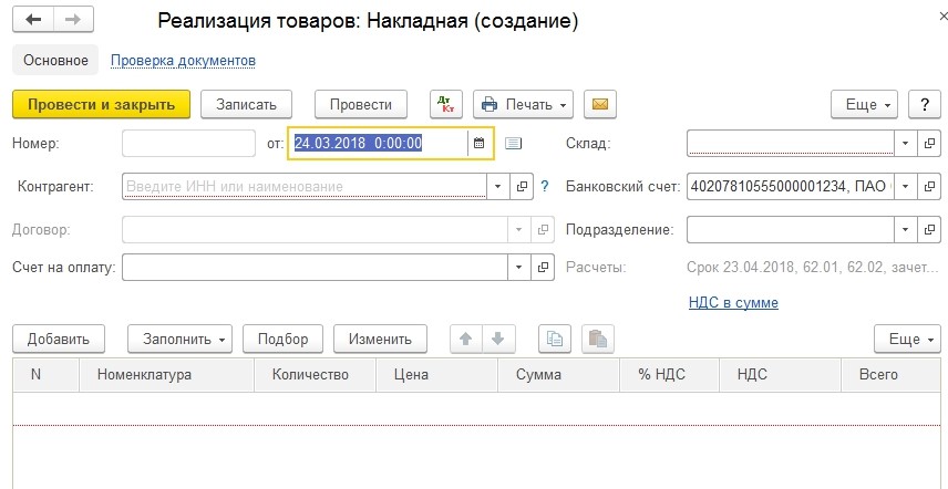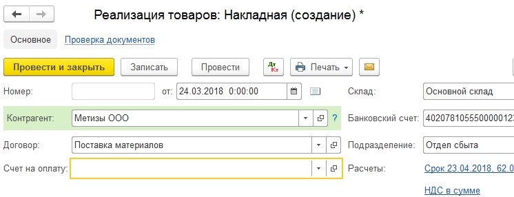 Шапка документа имеет две гиперссылки и при переходе пользователя по ним, демонстрируются расчёты с покупателем/контрагентом, типы цен и НДС. В основном, программа предлагает оптимальные значения по умолчанию и пользователю скорее не придётся ничего менять. В случае, если всё-таки придётся поменять значения (счёт расчётов, платежи, НДС), то это можно выполнить, перейдя в отдельные окна.
