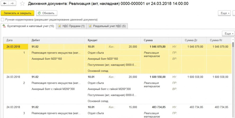 Проведя данные операции, проводки продаж материалов будут сформированы в системе пользователя.