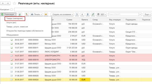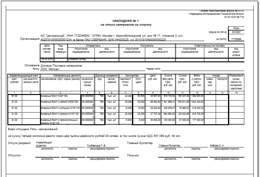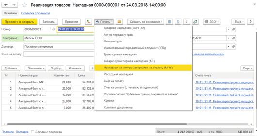 Процесс реализаций какого-либо типа товарно-материальной ценности имеет подтверждение в качестве унифицированных, печатных форм документации. Процесс реализации осуществляется с помощью накладной на уход материальных ценностей и имеет форму М-15, данную форму можно создать из документа реализации: