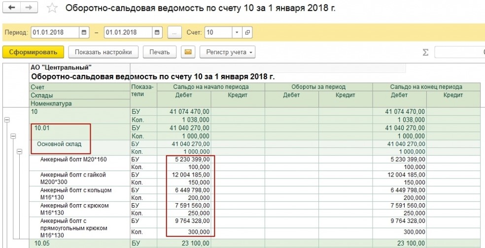 По состоянию отчёта имеются существенные остатки по материалам на субсчете 10.01, размещённые в основном организационном складе.