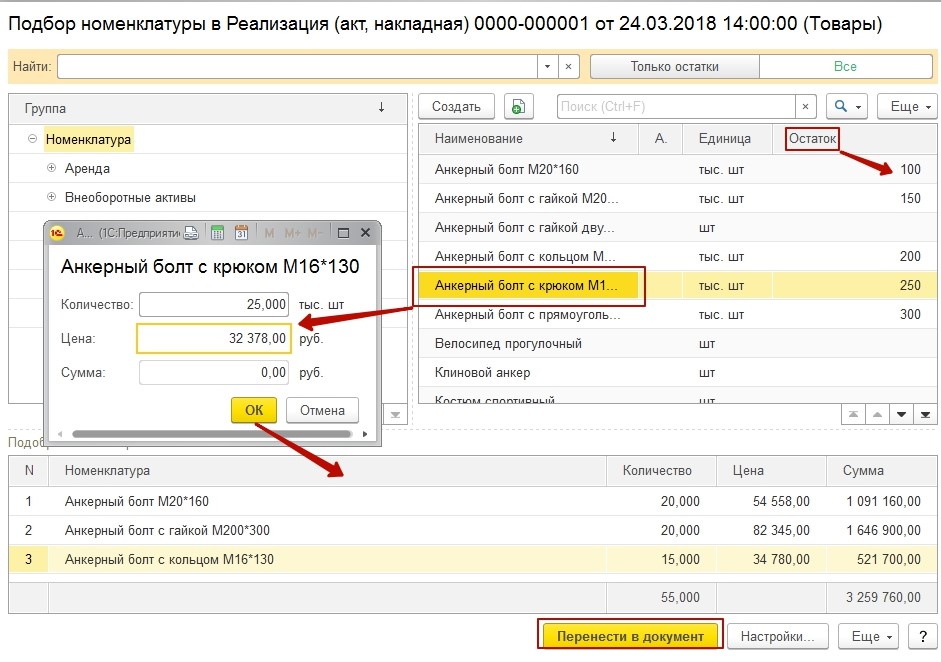 В открывающемся окне подбора, можно заметить предустановленный режим ввода остатков, в котором настроено заполнение с учётом цены и количества предлагаемого к продаже материала.  Выбрав нужную карточку номенклатуры и указав цену и количество, информация переводится с помощью кнопки «Перенести в документ».