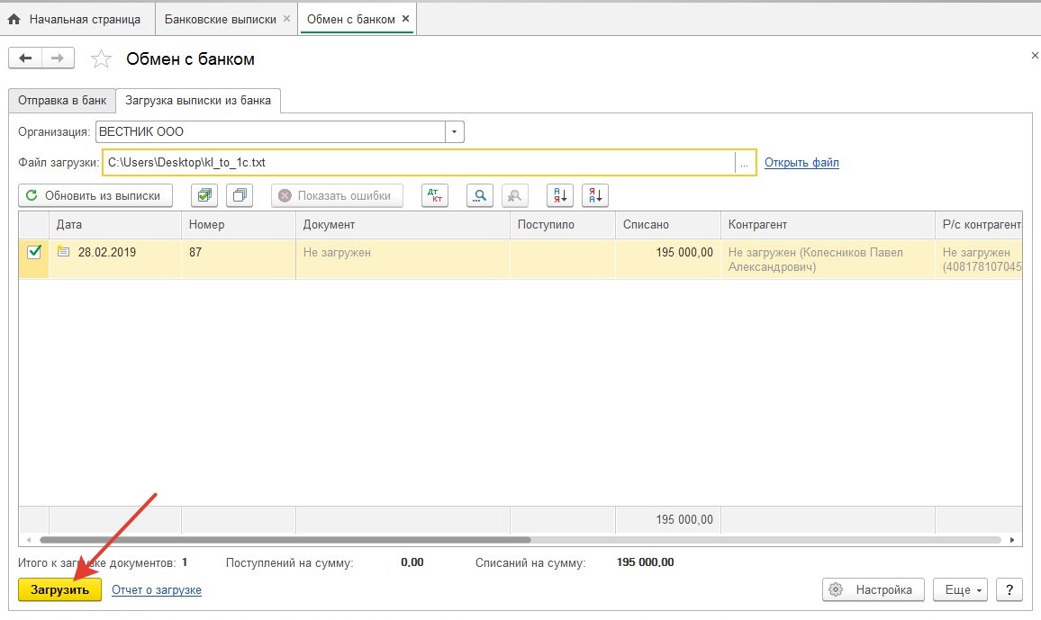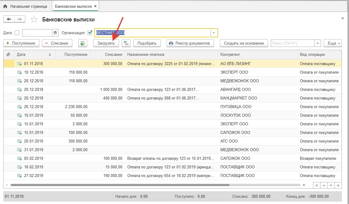 Таким же образом подгружаются выписки по другим расчетным счетам.