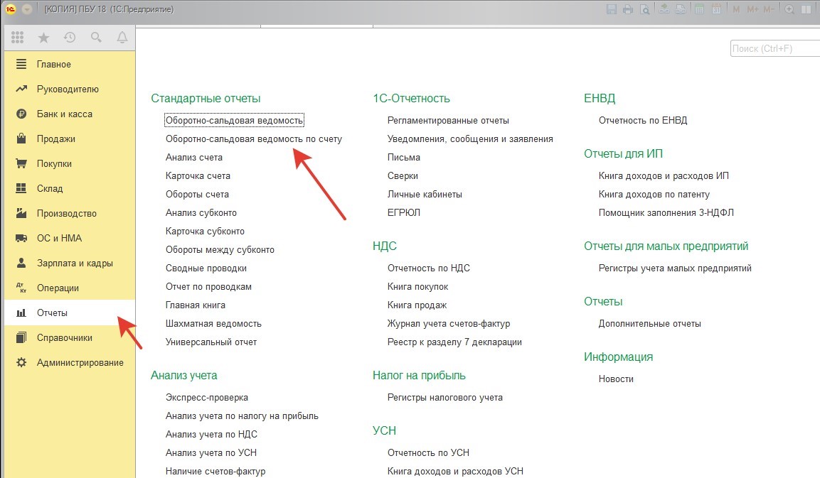 Для этого выбирают «отчеты» на панели разделов, открывают подпункт «Оборотно-сальдовая ведомость по счету»: