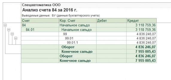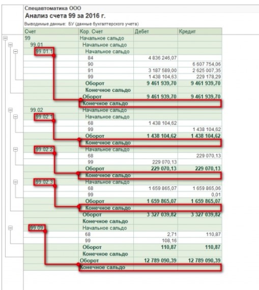 Теперь следует проверить счет 99. Для этого необходимо воспользоваться отчетом "Анализ счета".
