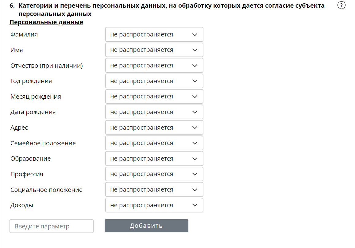 - категории и перечень данных, для обработки которых владелец указывает условия и запреты, а также список этих условий и запретов;