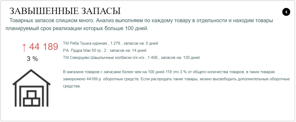Товары группы "А". Эта группа товаров приносит львиную часть выручки торговой точки. Из отчета становится ясно, что тут была допущена оплошность. Программа описывает сложившуюся ситуацию достаточно простым и понятным языком. Не большого массива информации, программа дает ясные и четкие указания для решения проблемы с товарами группы "А".