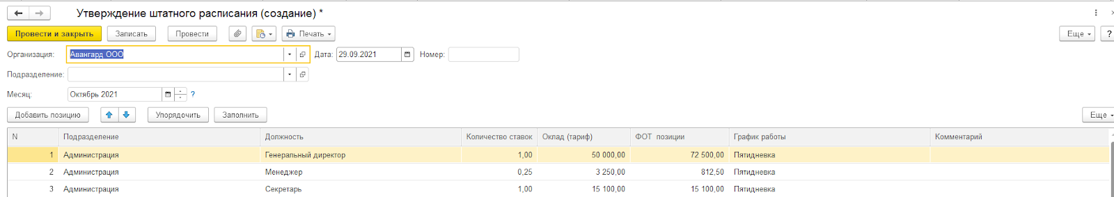 Чтобы первоначально ввести позиции в штатку и зафиксировать его существенные изменения, применяется документ «Утверждение штатного расписания». Для его формирования пользователь заходит в меню «Кадры», выбирает «Изменение штатного расписания», нажимает «Создать» и далее «Утверждение штатного расписания». На основании этого документа утверждается расписание лишь на 1-ое число выбранного месяца, а потому он применяется при изначальном утверждении штатки, а также при серьезном изменении информации в ней (по факту — при замене текущего штатного расписания на новое).