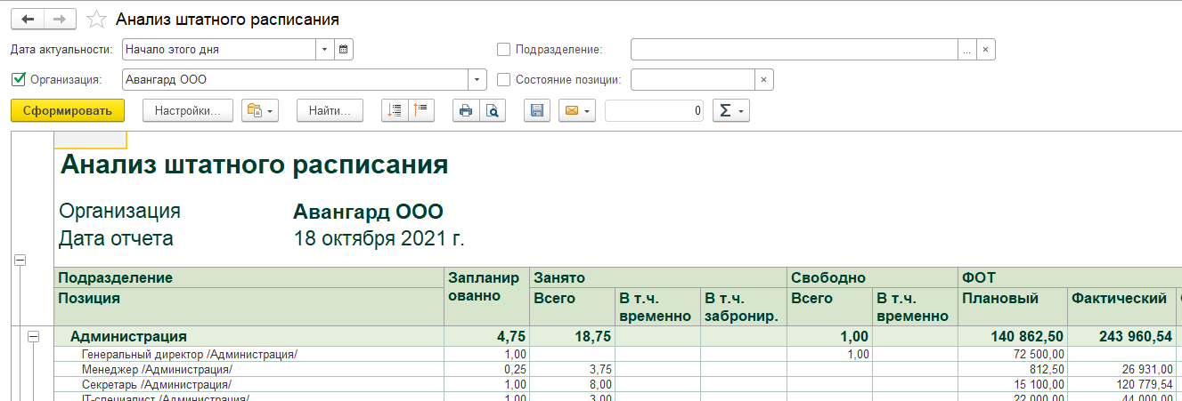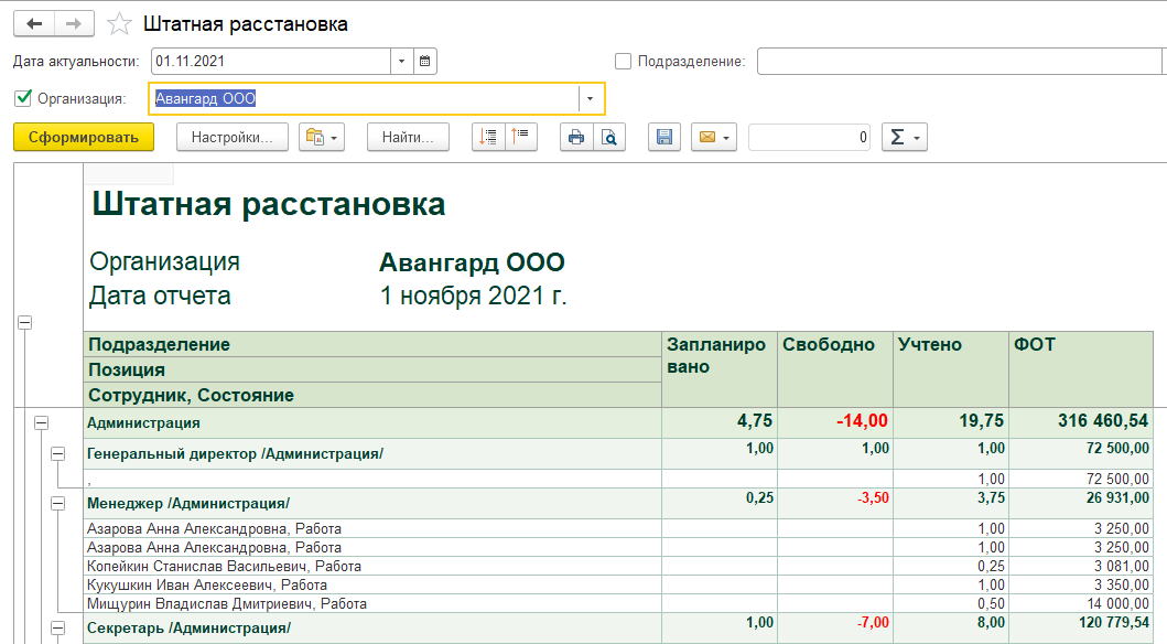 Перечень работников, занимающих позиции штатного расписания на конкретную дату, забронированные позиции