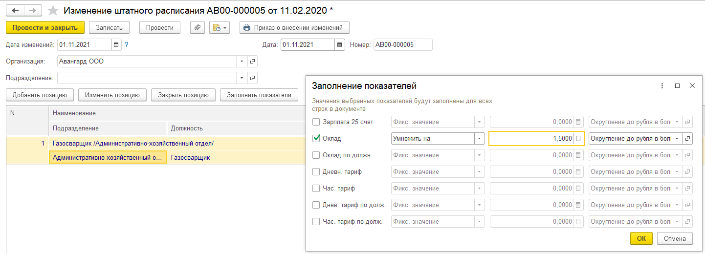 Индексация заработка в программе проводится для позиций штатного расписания и для работников. Для регистрации индексации заработка используется документ — «Изменение штатного расписания». При нажатии кнопки «Заполнить показатели» пользователь может обработать показатели сразу по всем позициям штатного расписания.