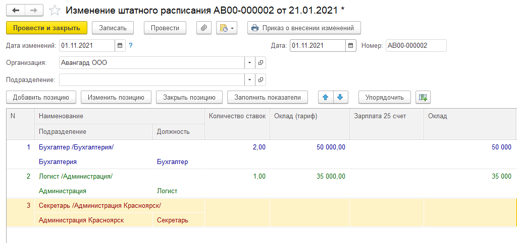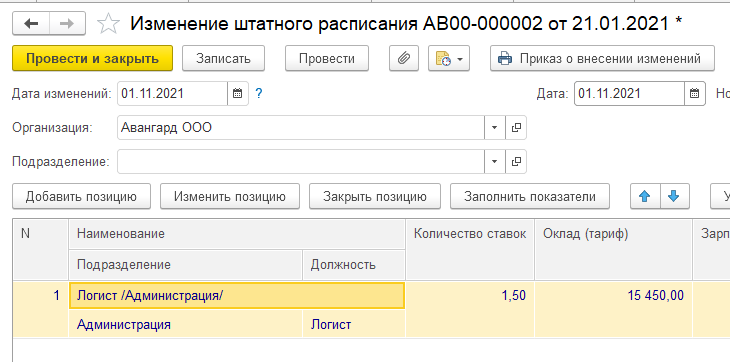 Через кнопку «Приказ о внесении изменений» пользователь может сформировать печатную форму приказа о внесении изменений в штатное расписание.