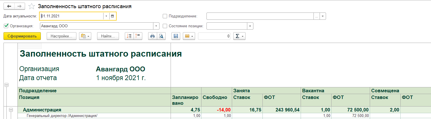 Занятые, запланированные и вакантные должности (по подразделениям и конкретным позициям)