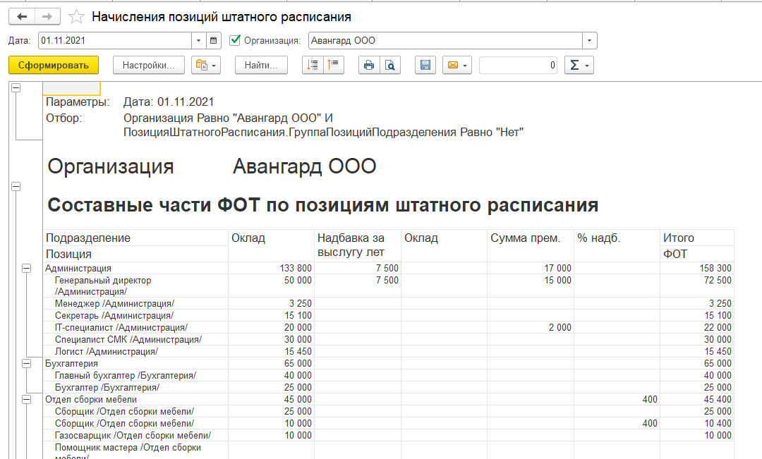 Начисления по позициям штатного расписания и их вклад в фонд оплаты труда