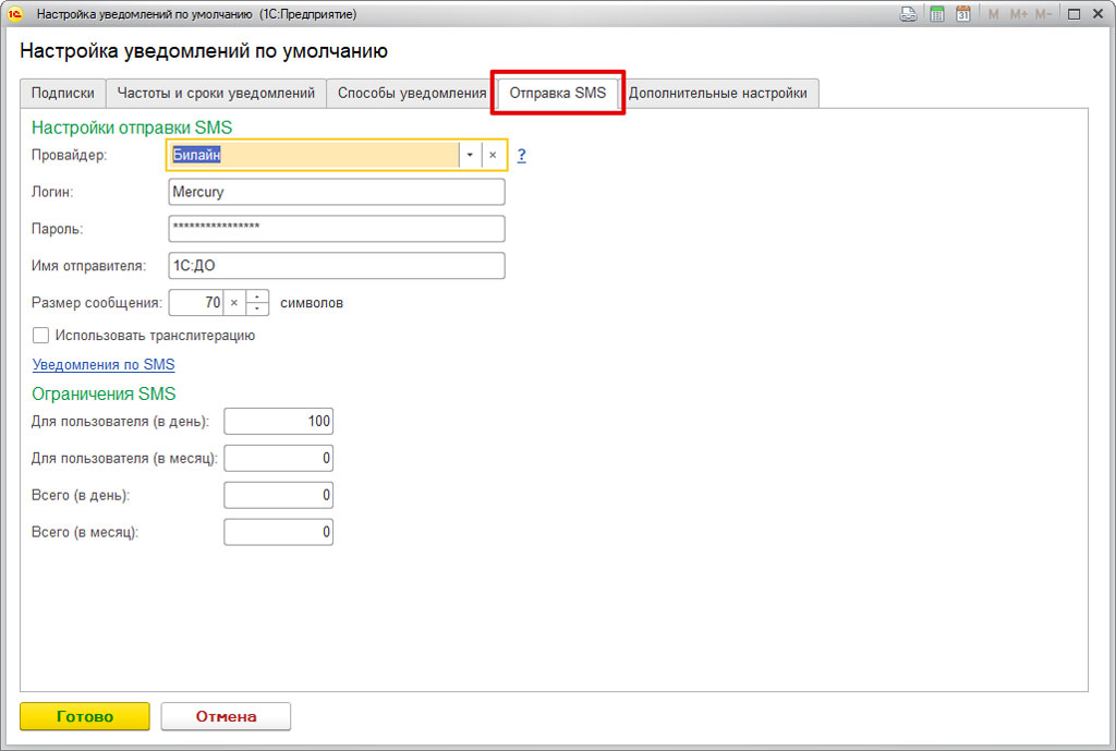 Настройки идентичны настройкам по умолчанию, но здесь нельзя управлять СМС-срообщениями. Управлять ими может только администратор системы.