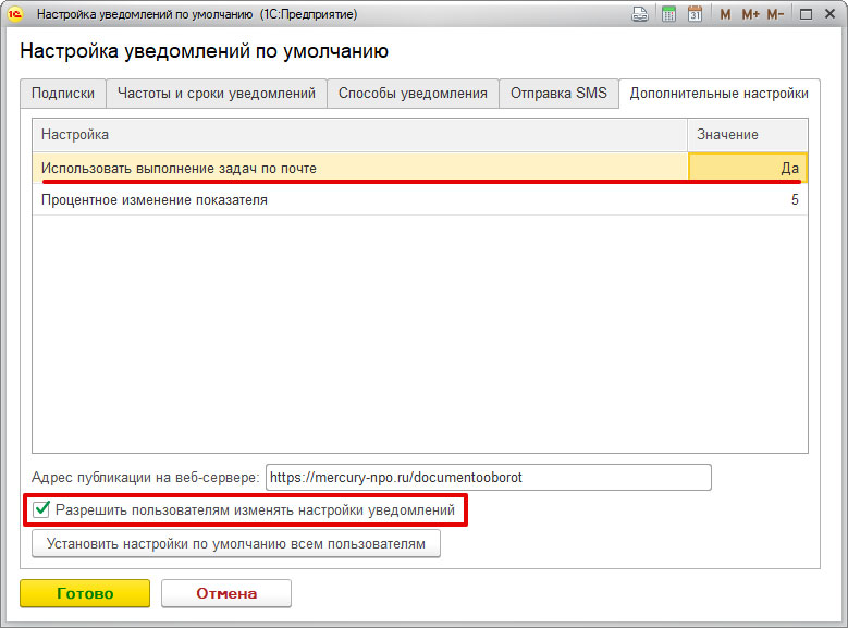 В этом окне указываем адрес публикации СЭД на веб сервере, устанавливаем разрешение на настройку уведомлений под себя, а также у вас будет возможность выставить настройку сразу всем пользователям системы, но сбросятся их изменения уведомлений.