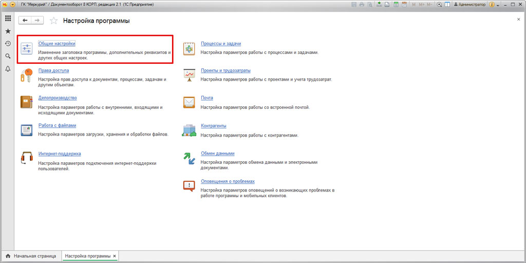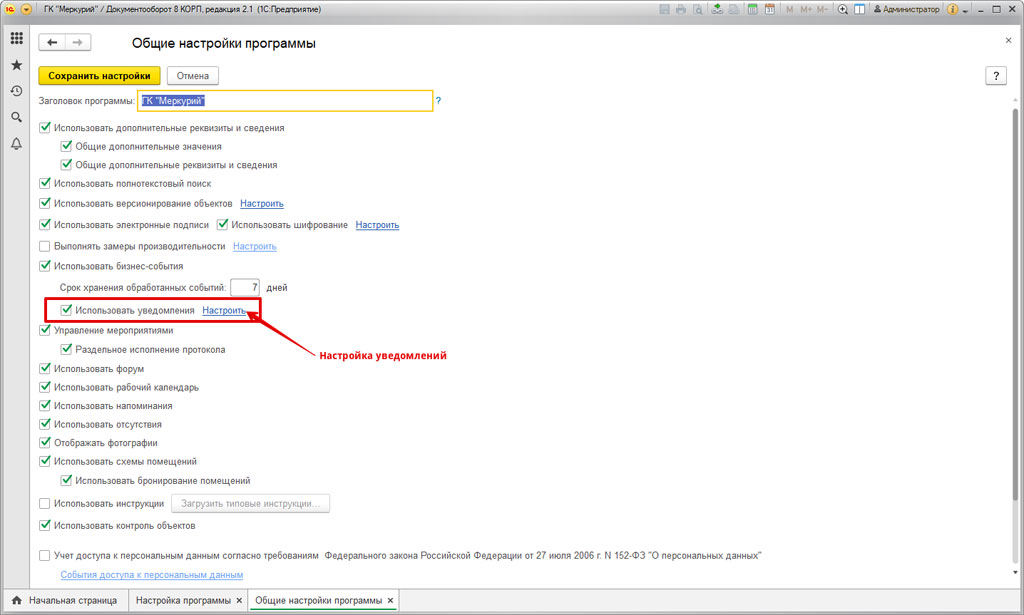 Для настроек уведомлений, администратору нужно перейти в "Настройка и администрирование", дальше заходим в "Настройки программы", дальше переходим в "Общие настройки программы".