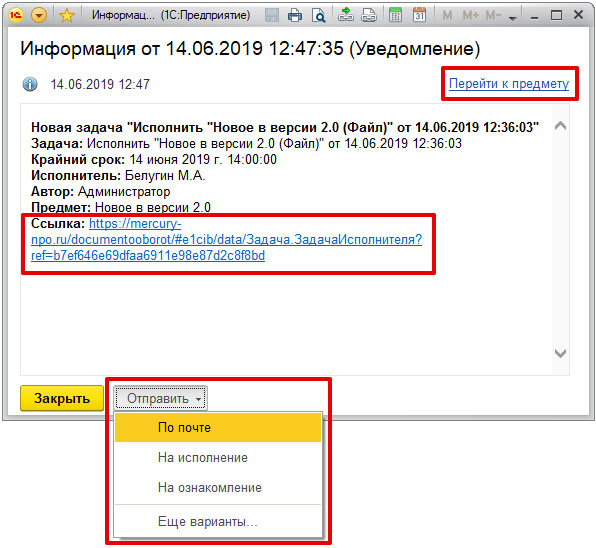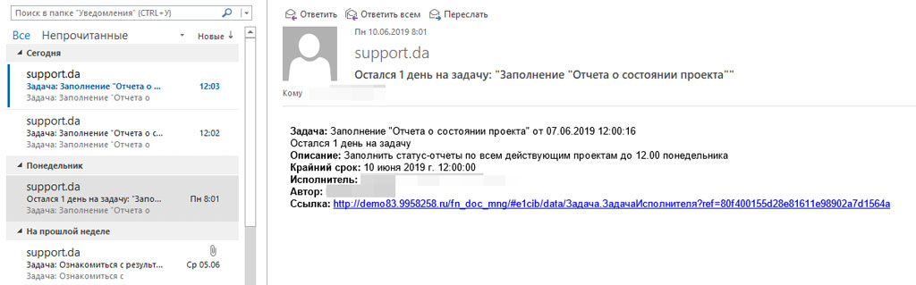 Открыв письмо на почте, вы сможете сразу перейти к нужной задаче перейдя по ссылке