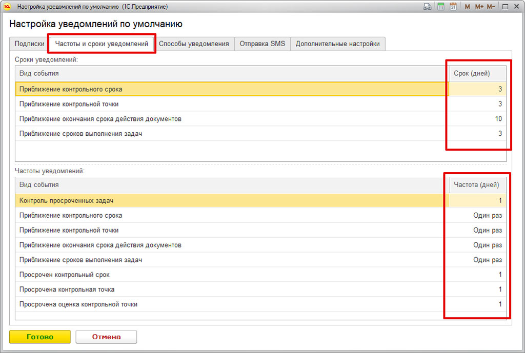 После чего, в верхнем окне, у вас появиться возможность настроить количество дней до события, после которого система автоматически будет уведомлять пользователя. В нижнем окне, пользователь может задать периодичность уведомлений.