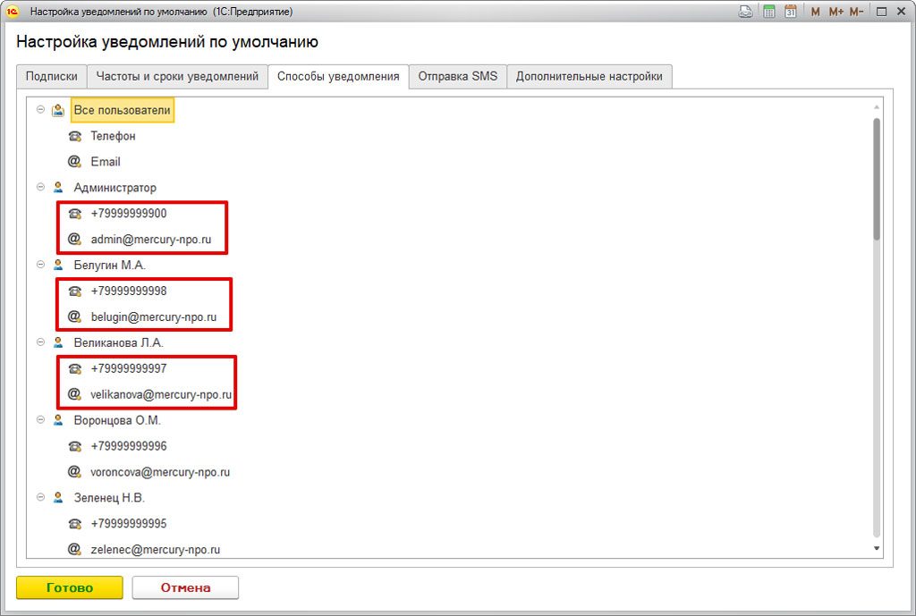 Способы уведомлений можно настроить в специальном окне, все ссылки интерактивные, таким образом при нажатии на ссылки вы сразу перейдете к карточке пользователя для изменения или внесения контактной информации.