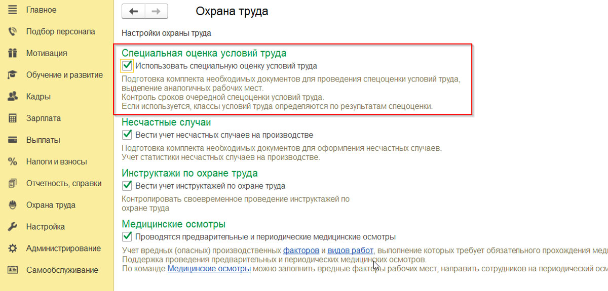 Для получения полной картины корректного отображения СОУТ, сделаем полный разбор примера. Для того, чтобы запустить процесс, необходимо найти вкладку "Настройка-Охрана труда". Далее активируйте опцию спецоценки условий труда.