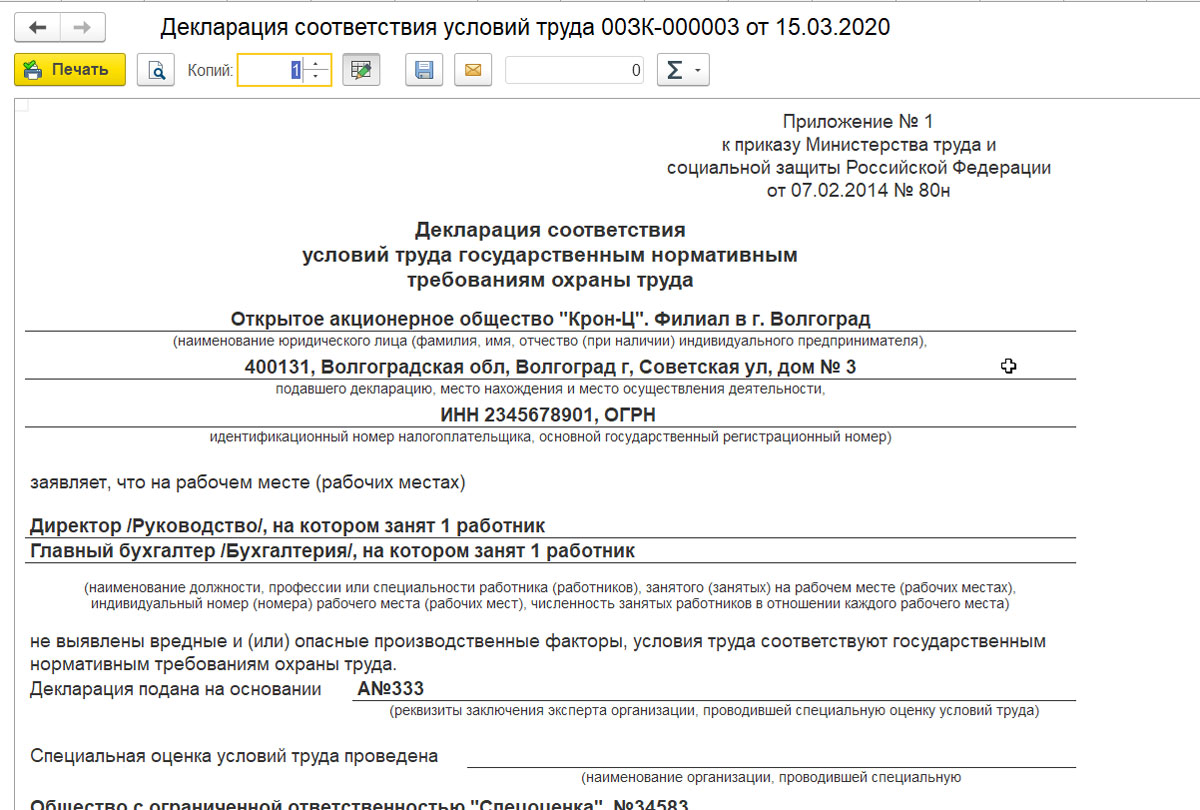 В этом месте найдут отражение только рабочие места без угрожающих факторов. Именно они и будут указаны в напечатанной декларации.