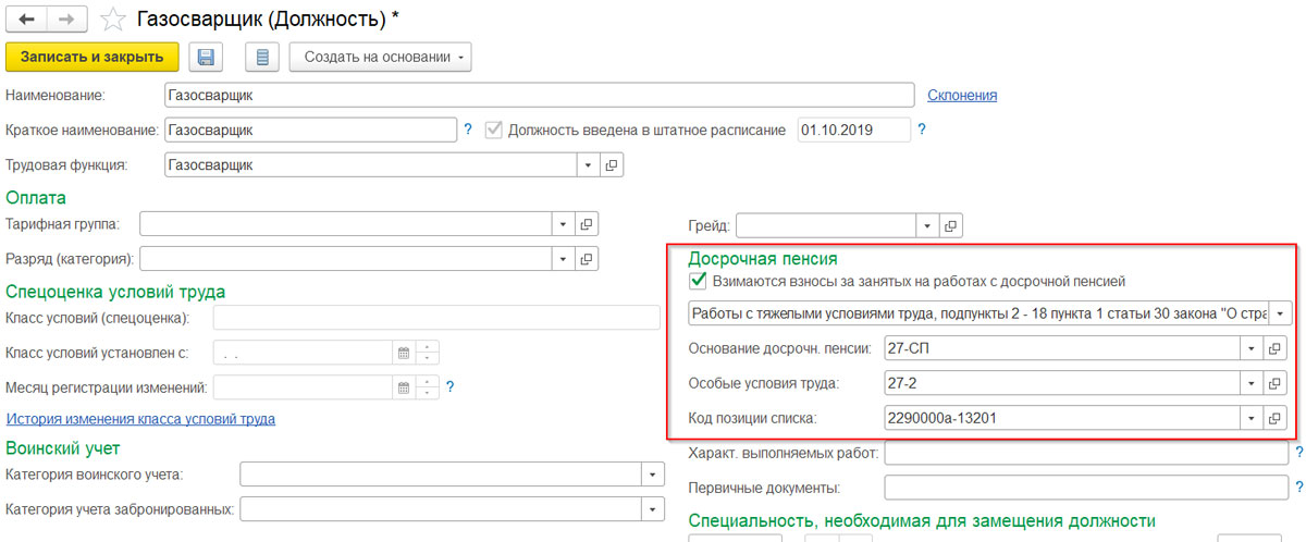 Именно в этой вкладке будут указаны основания для получения досрочной пенсии. Вкладки "Основание досрочной пенсии", а так же "Особые условия труда" заполняются путем активации подходящих значений из вкладки "Должности".