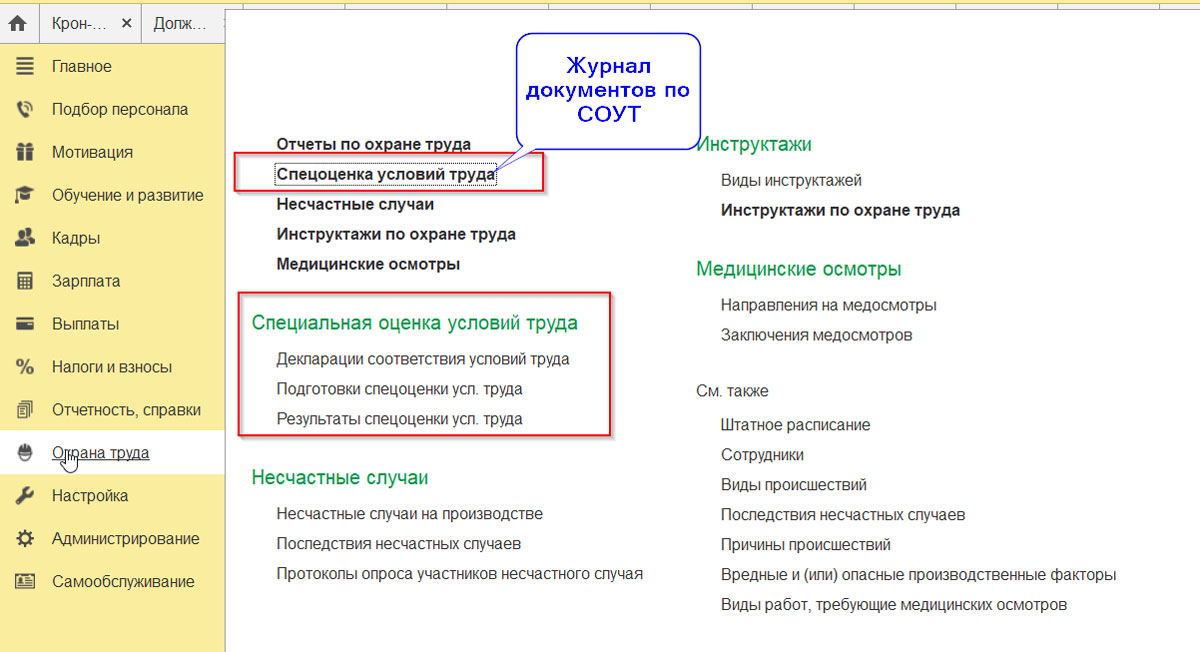 Активация этой опции приведет к появлению в этой вкладке документов по СОУТ и журнала документов.