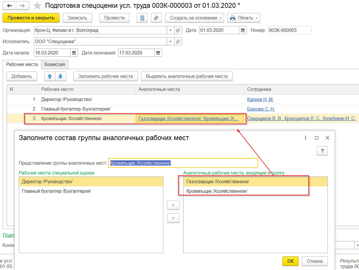 Если у компании существуют аналоги рабочих мест, их можно установить, активировав опцию "Выделить аналогичные рабочие места". Для методов спецоценки они совершенно одинаковы. Как пример, можно отметить, что аналогом газосварщика является кровельщик.