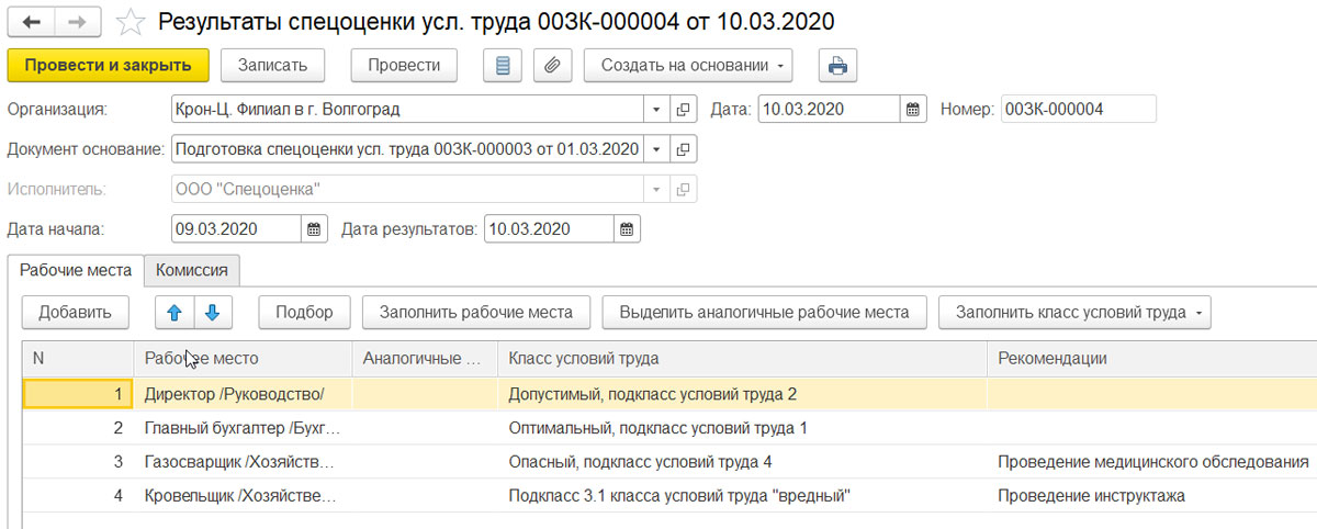Его формирование происходит на базе документа подготовки. В нем находят отражение результаты оценки рабочих мест. Появится информация о всех классах условий труда. Предусмотрена опция добавления рекомендаций.