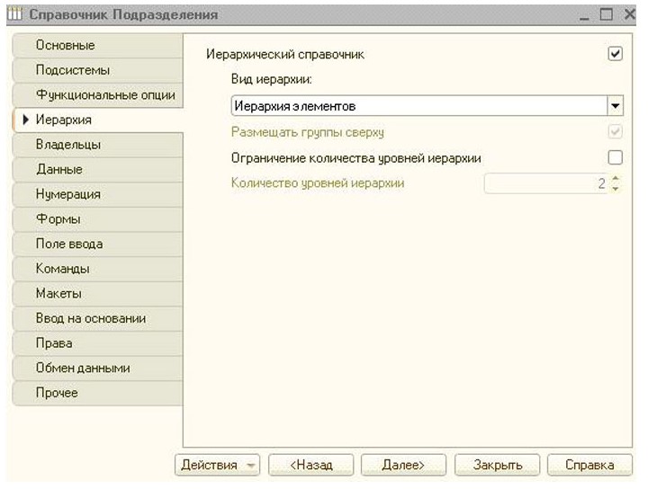 Новый справочник будет иметь иерархическую структуру, ведь разные подразделения могут входить одно в другое. По замыслу, наше предприятие не имеет групп подразделений, поэтому подходит тип «Иерархия элементов». Ограничений вложенности, также не предполагается.