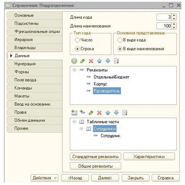 Вкладка «Данные» определяет характер информации, которая может быть добавлена в справочник 1С. Наименование и код настраивается сверху, что является стандартными реквизитами, а в центре – перечень добавленных реквизитов. Нижняя часть отображает табличные части справочника.