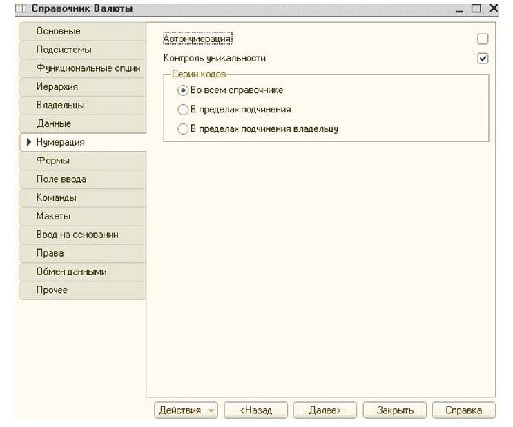 За определение функциональности при использовании того или иного справочника, отвечает вкладка «Функциональные опции». Закладка с названием «Иерархия» необходима для создания вложенных элементов выбранного справочника. Очень удобно и полезно, иногда использовать иерархические виды справочников.