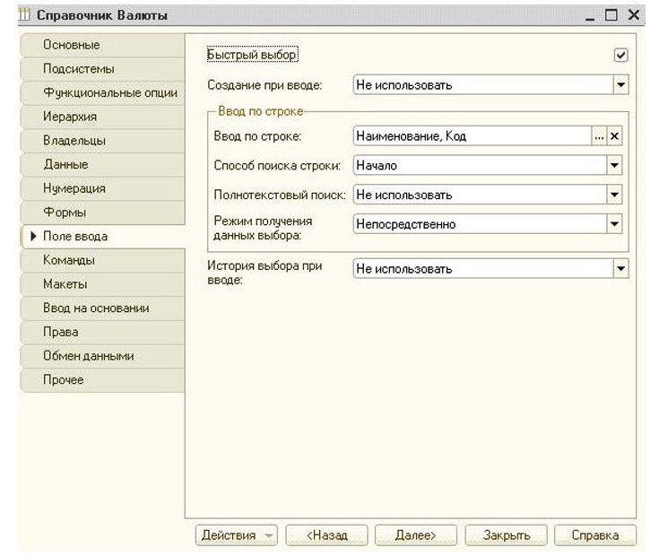 Для создания комфортных условий работы пользователей, необходима грамотная и тщательная настройка соответственных параметров вкладки «Поле ввода». Найти необходимый элемент помогут параметры «Быстрый выбор/Ввод по строке/Полнотекстовый поиск». Ранее используемые позиции можно сохранять, для этого существует «История выбора при вводе».