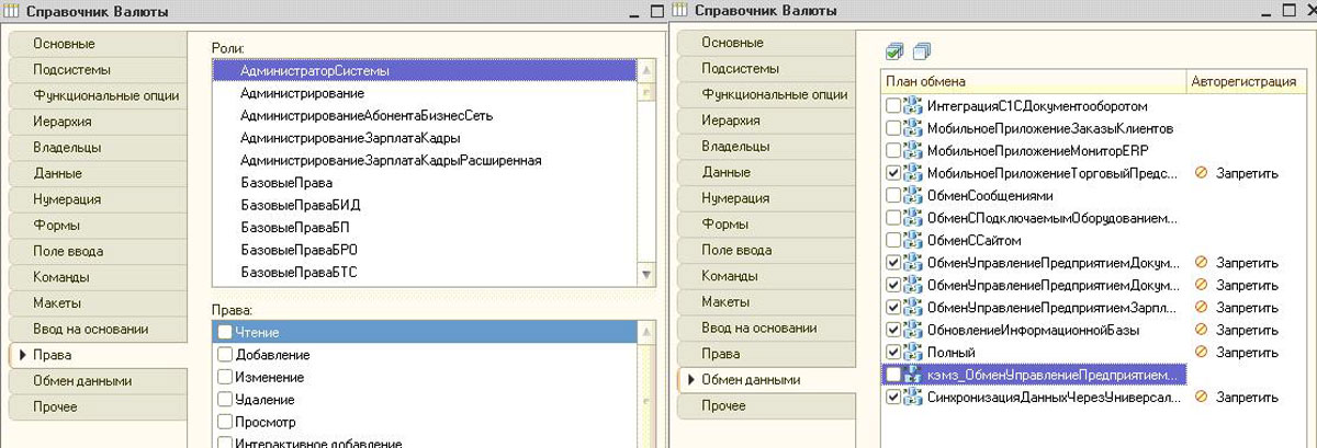 Отдельный подраздел «Права», содержит информацию касательно того, какие роли включают в себя доступ к справочнику, включая изменение, заполнение и чтение справочников. Об участие справочников в планах обмена, расскажет вкладка «Обмен данными». Для перехода в модули написания функций и процедур, нужна последняя вкладка. Здесь же находится перечень заранее заданных значений справочника, к которым есть возможность обращаться напрямую в коде.