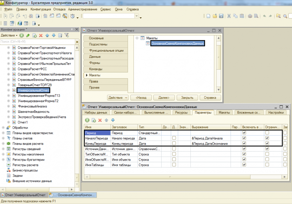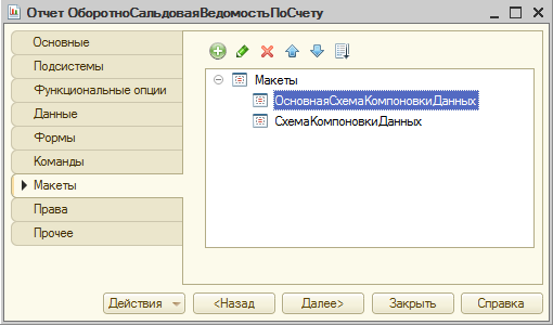 Для начала откроем конфигурацию базы и перейдем в «Макеты». Пользователю необходимо выбрать «Схемы компоновки данных» – раздел для установки параметров.