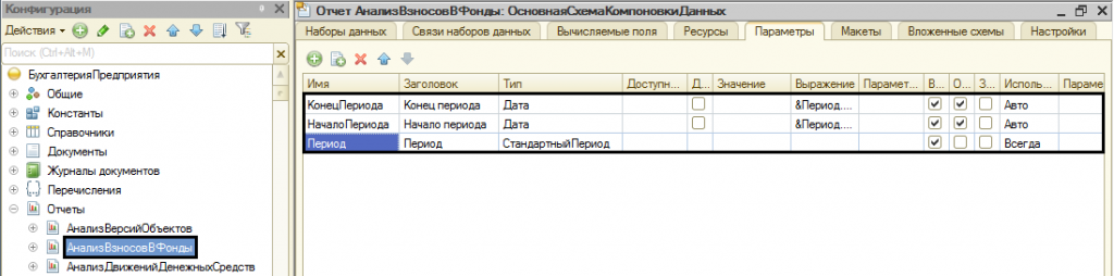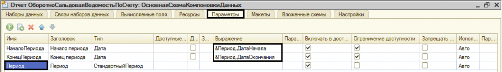 Теперь переходим к «Параметрам». В отчете мы имеем два основных параметра – Начало Периода и Конец Периода. Добавим третий – Стандартный период с установкой типа «СтандартныйПериод». В колонке «Выражение» пропишем следующее: &Период.ДатаНачала и &Период.ДатаОкончания. Обязательно устанавливаем флажок «Ограничение доступности».