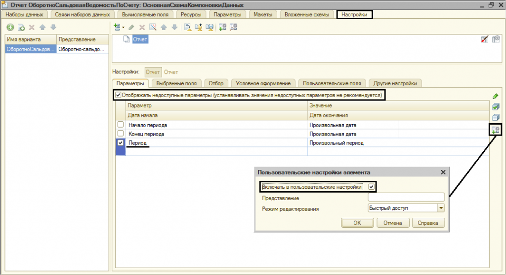 Далее активируем вкладку «Настройки», устанавливаем галочку «Отображать недоступные параметры» и переходим в пользовательские настройки указанного параметра – «Период». На мониторе откроется окно, где необходимо установить флажок напротив «Включать в пользовательские настройки».