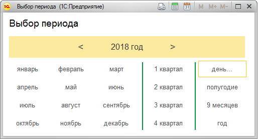 После обновления данных в конфигурации, переходим в пользовательский режим. Выбор периода включает в себя несколько стандартных вариантов: день, 6 или 9 месяцев, 1 год.