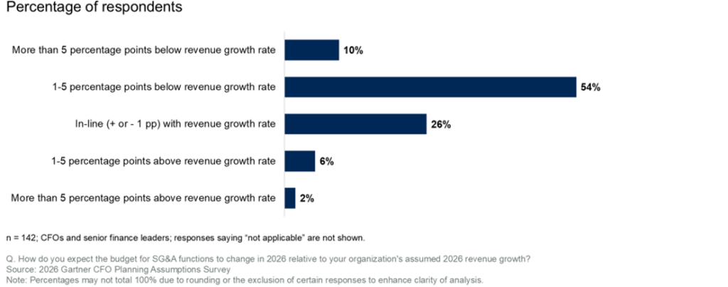 Один из самых устойчивых и наглядных трендов в повестке CFO на 2026 год, который отмечают аналитики Gartner, — осознанное сдерживание административно-управленческих расходов даже на фоне планируемого роста выручки. Около 54% финансовых директоров закладывают в бюджеты сценарий, при котором накладные и управленческие расходы растут медленнее доходов компании. В большинстве случаев разрыв между темпами роста выручки и расходов составляет от 1% до 5%.