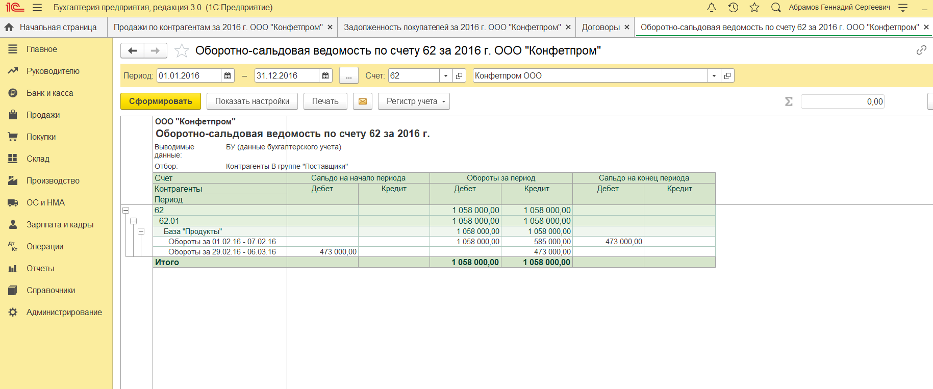 Отчет показывает начальные и конечные остатки, а также обороты за период для выбранного счета. Выбираем счет 60, если хотим посмотреть задолженность по поставщикам, и счет 62, если нас интересуют остатки и обороты по покупателям.