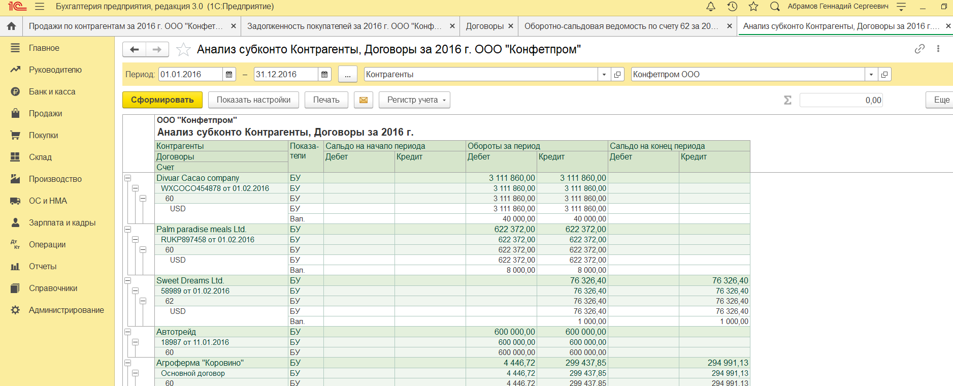Для счетов, по которым ведется аналитический учет, можно сформировать отчет по объектам аналитического учета (субконто). Отчет формируется как по контрагентам в целом, так и в разрезе групп (покупатели, поставщики, учредители и т.д). Все настройки выполняются в пользовательском режиме.