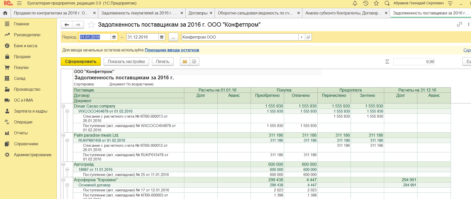Отчет покажет по какому контрагенту наша организация имеет неоплаченные обязательства или авансы (можно поставить группировку Поставщик, Договор и Документ).