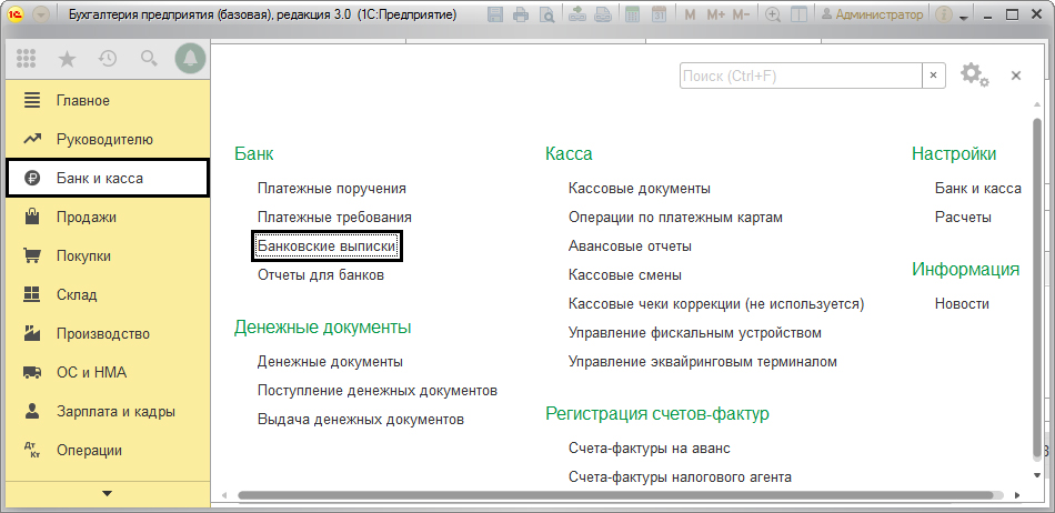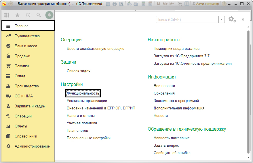 Чтобы операции отображались корректно, следует произвести соответствующие настройки. Для этого переходим в Главное, там в Настройки, там в Функциональность.