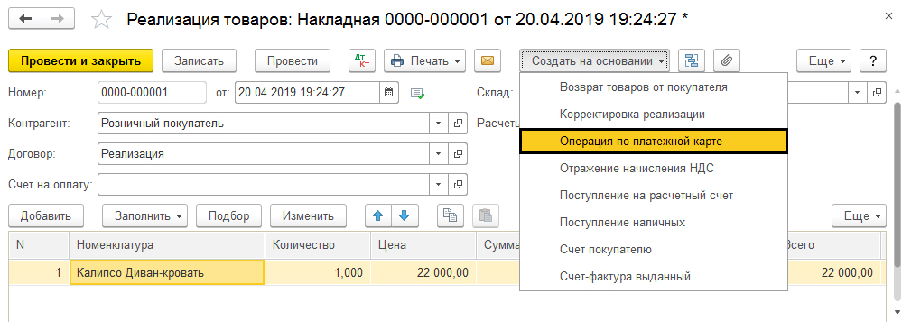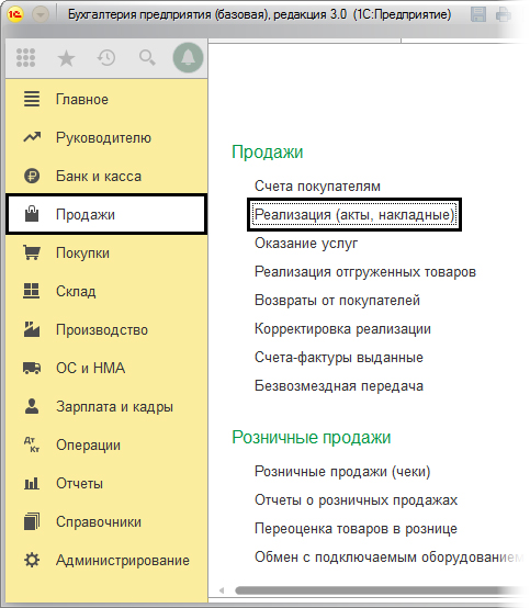 Чтобы пример был понятнее, покажем операцию "Реализация" в разделе "Продажи".