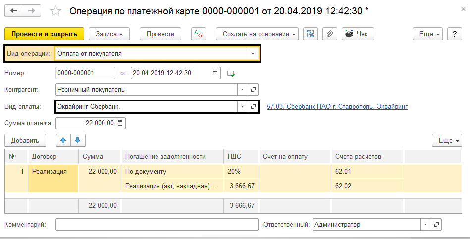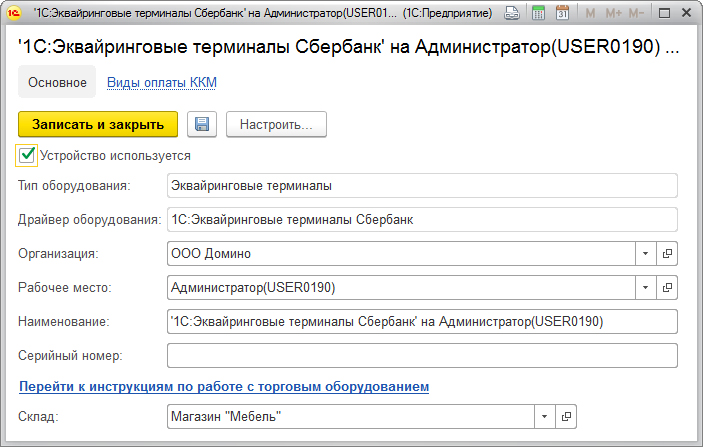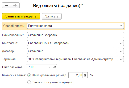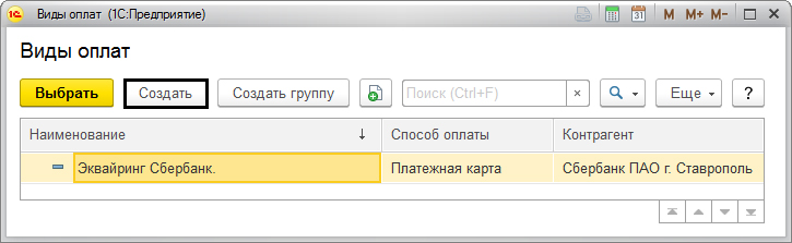 Впоследствии информация пригодится, когда будет заполняться справочник по видам оплат, с данными из документа, отражающим операцию по оплате картой. Справочник можно найти через соответствующий раздел.