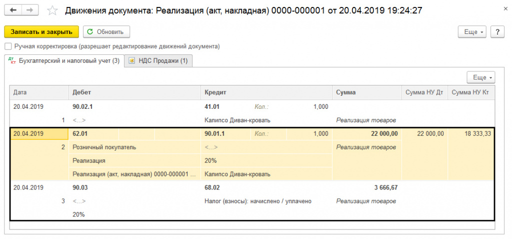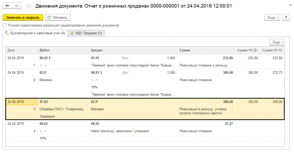 Дальше отмечается факт реализации товара, следует принять во внимание и время, когда документ обрабатывался.