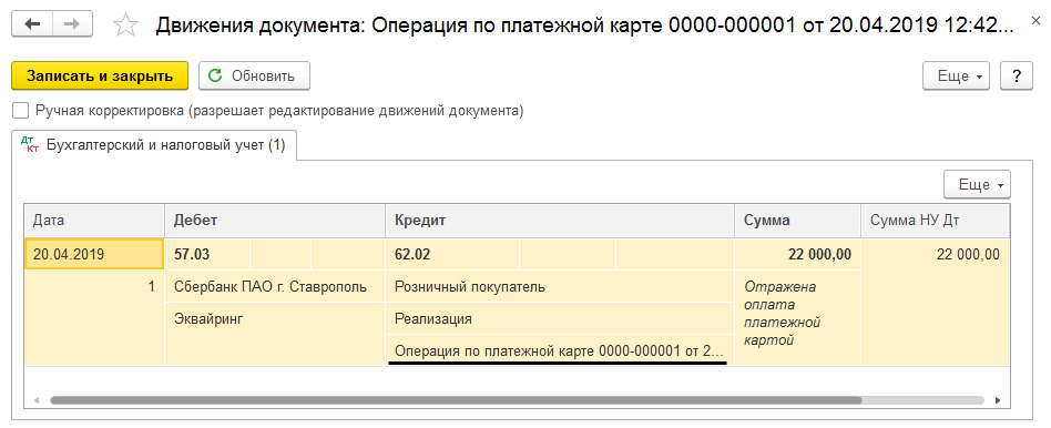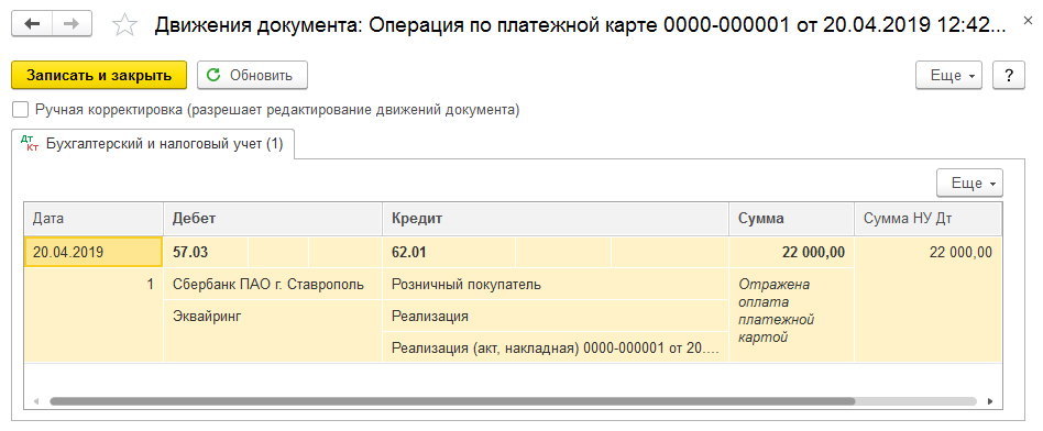 Для отображения в учёте операций реализации и оплате их через карту применяется т. н. счёт учёта 57 «Переводы в пути».