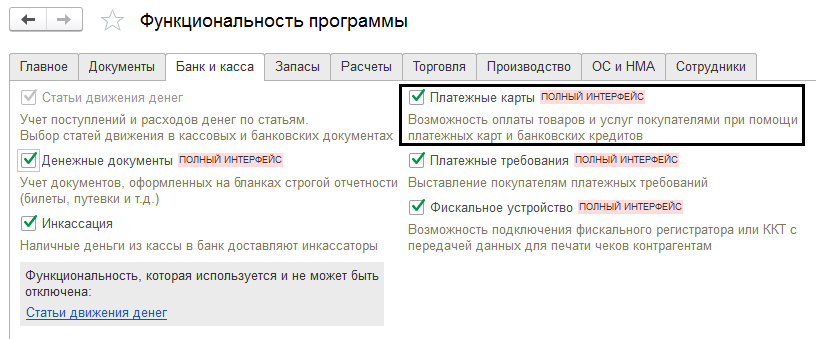 Там в "Банк и касса" (см. ниже) следует отметить галочку "Платёжные карты". Так появится возможность совершать операции с использованием этих карт и банковских кредитов.