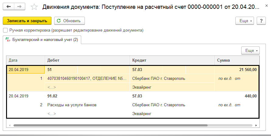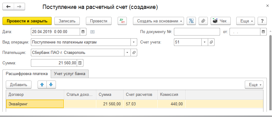 51 57.03 Деньги поступают на расчётный счёт (минус комиссионные) 21560