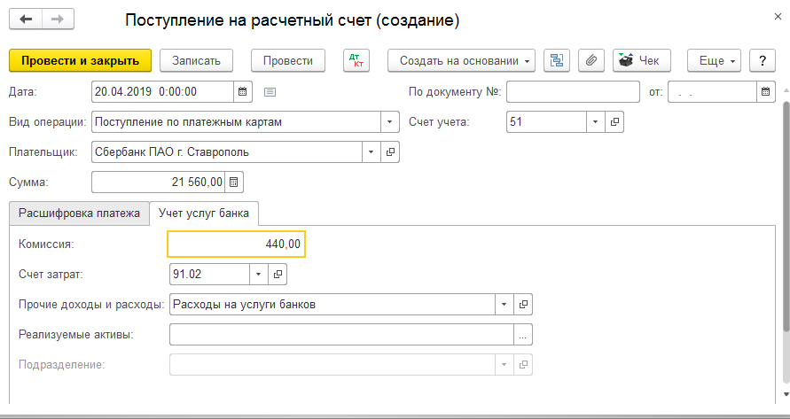 Можно ввести документ, использовав как основание "Оплату платёжной карты" через кнопку "Создать на основании" и далее указать "Поступление на расчётный счёт".